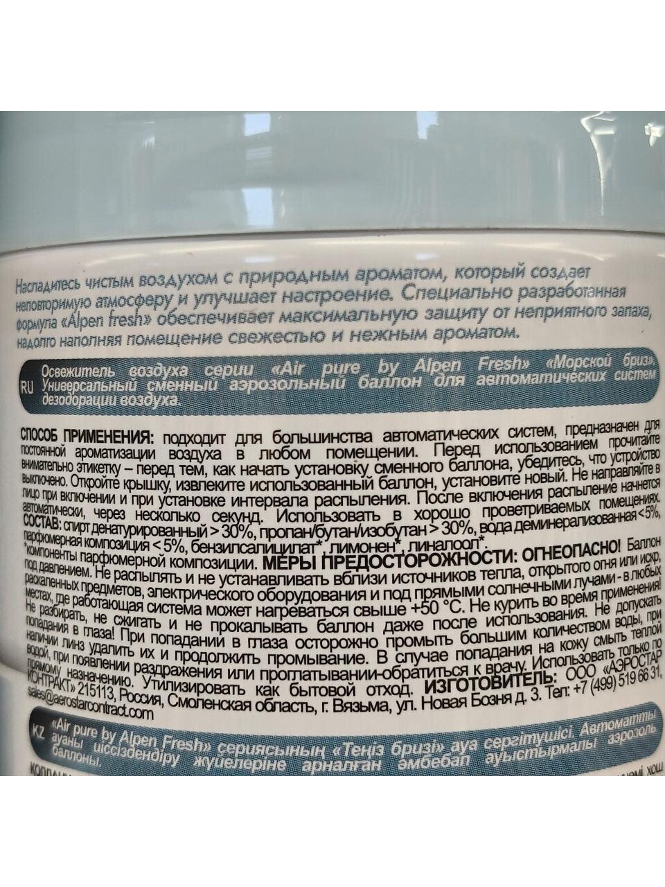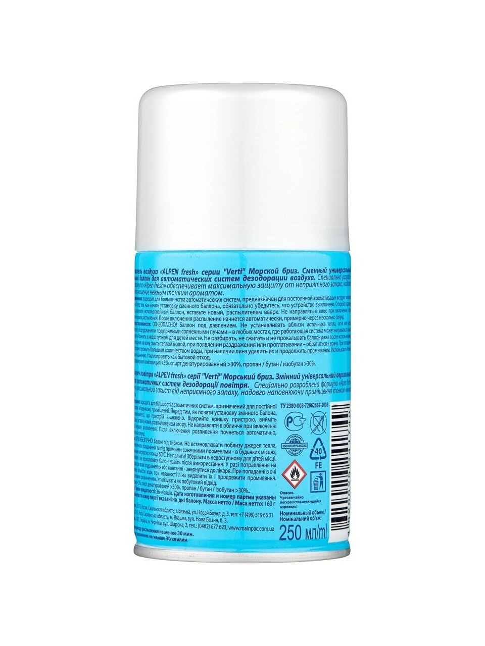 Освежитель воздуха "Alpen fresh" сменный универсальный аэрозольный баллон для автоматических систем дезодорации воздуха. Специально разработанная формула "Alpen fresh" обеспечивает максимальную защиту от неприятного запаха, надолго наполняя помещение нежным тонким ароматом.