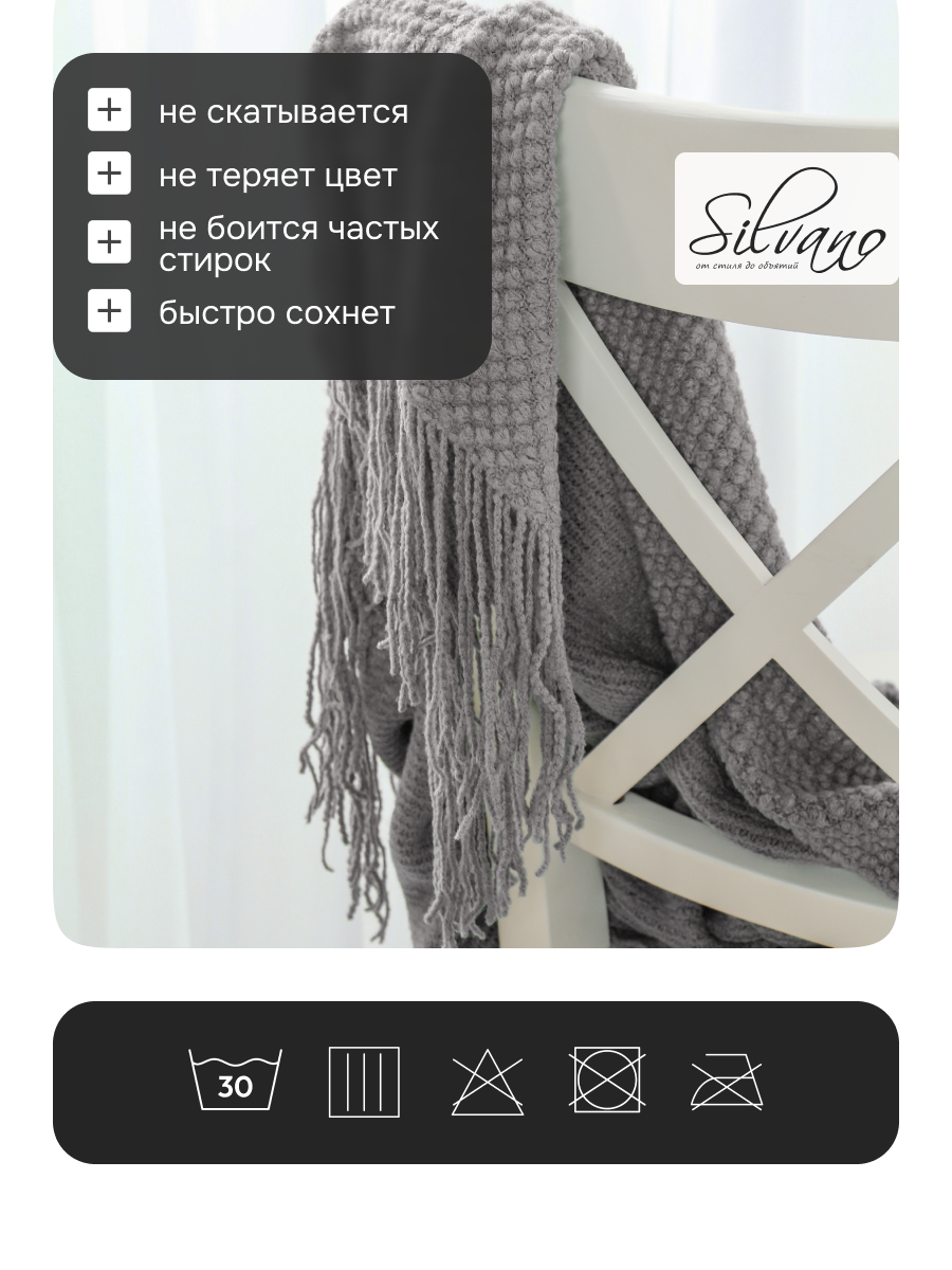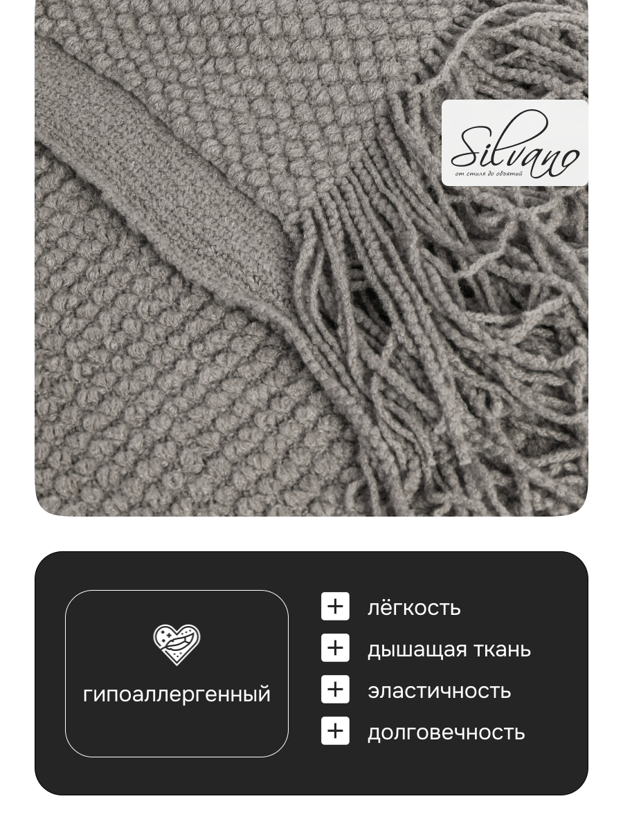 Часто спрашивают: "Как выбрать плед для дивана или кресла?", "Чем отличается вязаный плед от обычного?", "Подходит ли этот плед для подарка?". В отличие от аналогов без отделки, плед Silvano выделяется декоративной бахромой, что делает его более привлекательным для подарка или декора. Легкий, гипоаллергенный полиэстер не вызывает раздражения кожи и не накапливает пыль, поэтому идеален для аллергиков и детей. Плед не имеет ворса, что облегчает уход и предотвращает появление катышков — важное преимущество для ежедневного использования.