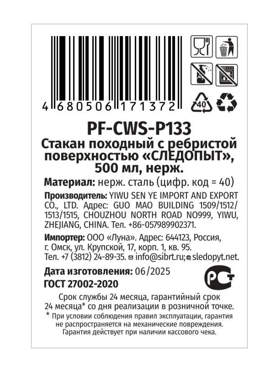 Походный стакан Следопыт PF-CWS-P133 — выбор опытных туристов и новичков, которым важна прочность и универсальность. Благодаря ребристой поверхности стакан удобно держать даже в перчатках или при влажных условиях. Объём 500 мл оптимален для горячих и холодных напитков, супов или каши на природе. Если вы ищете, какой походный стакан выбрать для дачи или путешествий, обратите внимание на нержавеющую сталь: она не ржавеет, не впитывает запахи, легко очищается и выдерживает перепады температур.