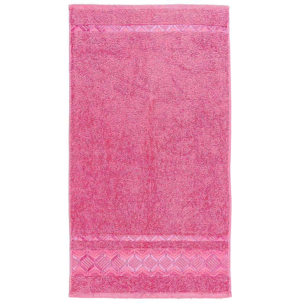 Размер 50х90 см, 100% хлопок, плотность 450 г/м2, махровая фактура, вес 0.2 кг, страна производства — Узбекистан, коллекция «Греция», цвет розовый, без отделки, предназначено для лица и рук.