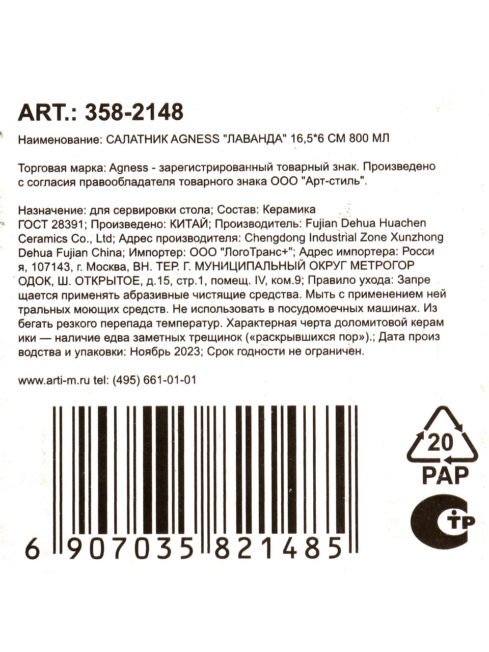 Салатник Agness «Лаванда» 0.8 л: стиль Прованс, керамика, идеален для подачи, сервировки и подарка. Эстетика и практичность для вашего дома.