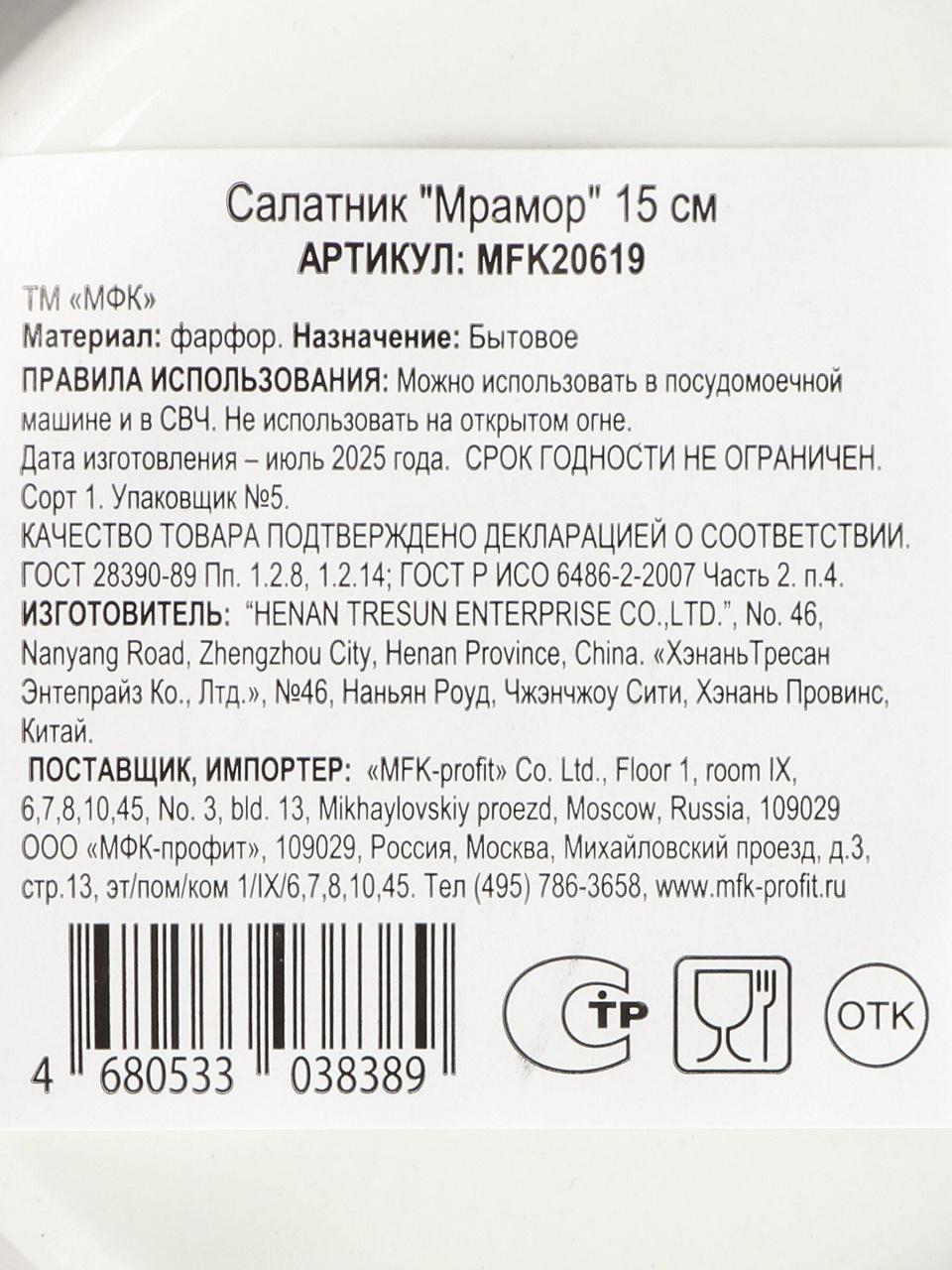 Вы можете приобрести «Салатник фарфор, круглый, 15х5 см, 350 мл, Мрамор, МФК, MFK20619» и другие товары в нашем интернет-магазине в Белгороде по низким ценам и с бесплатным самовывозом.
