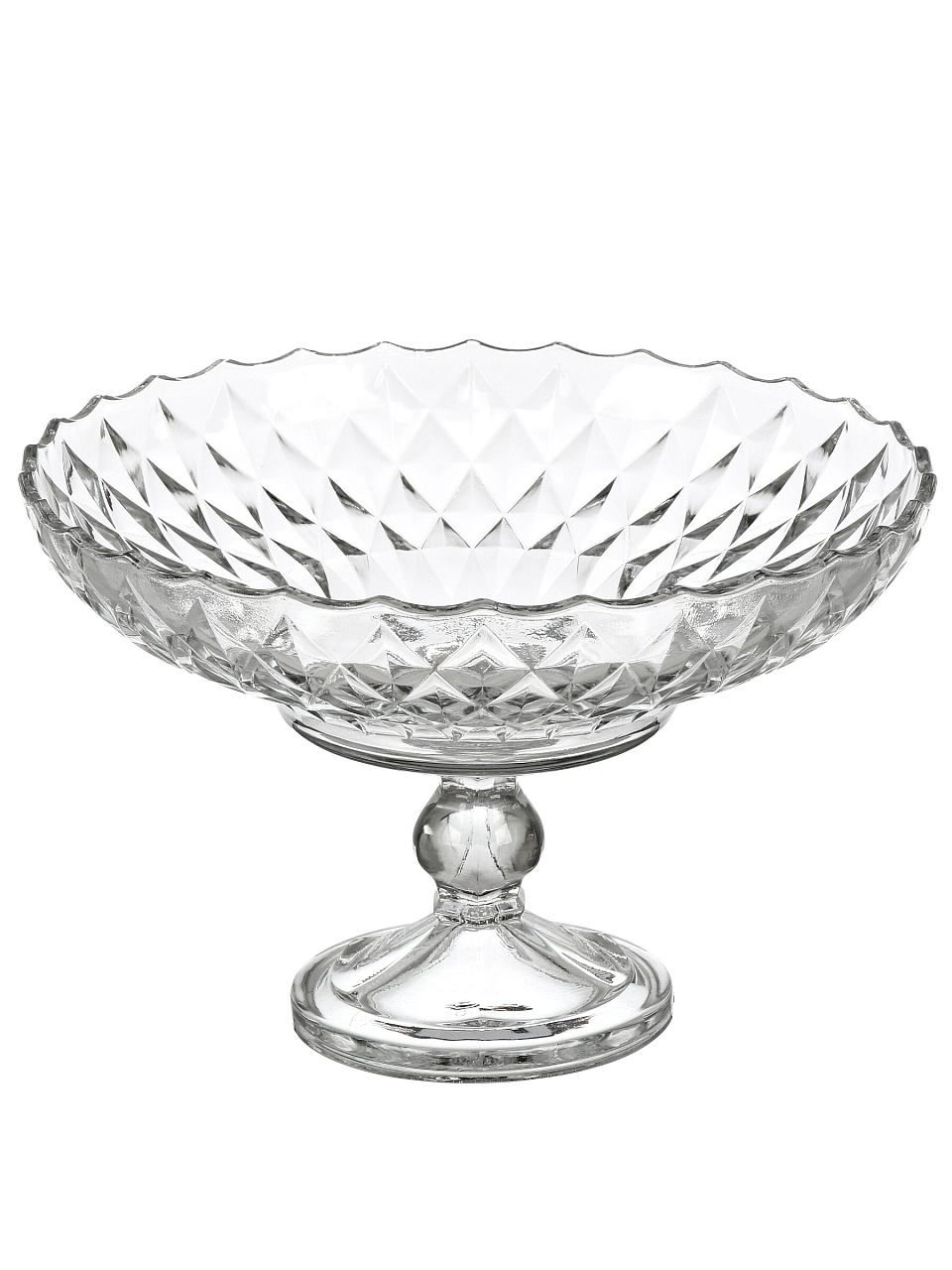 Модель круглая, на ножке, выполнена из бесцветного стекла с рельефным узором; в комплекте 1 салатник в подарочной упаковке.