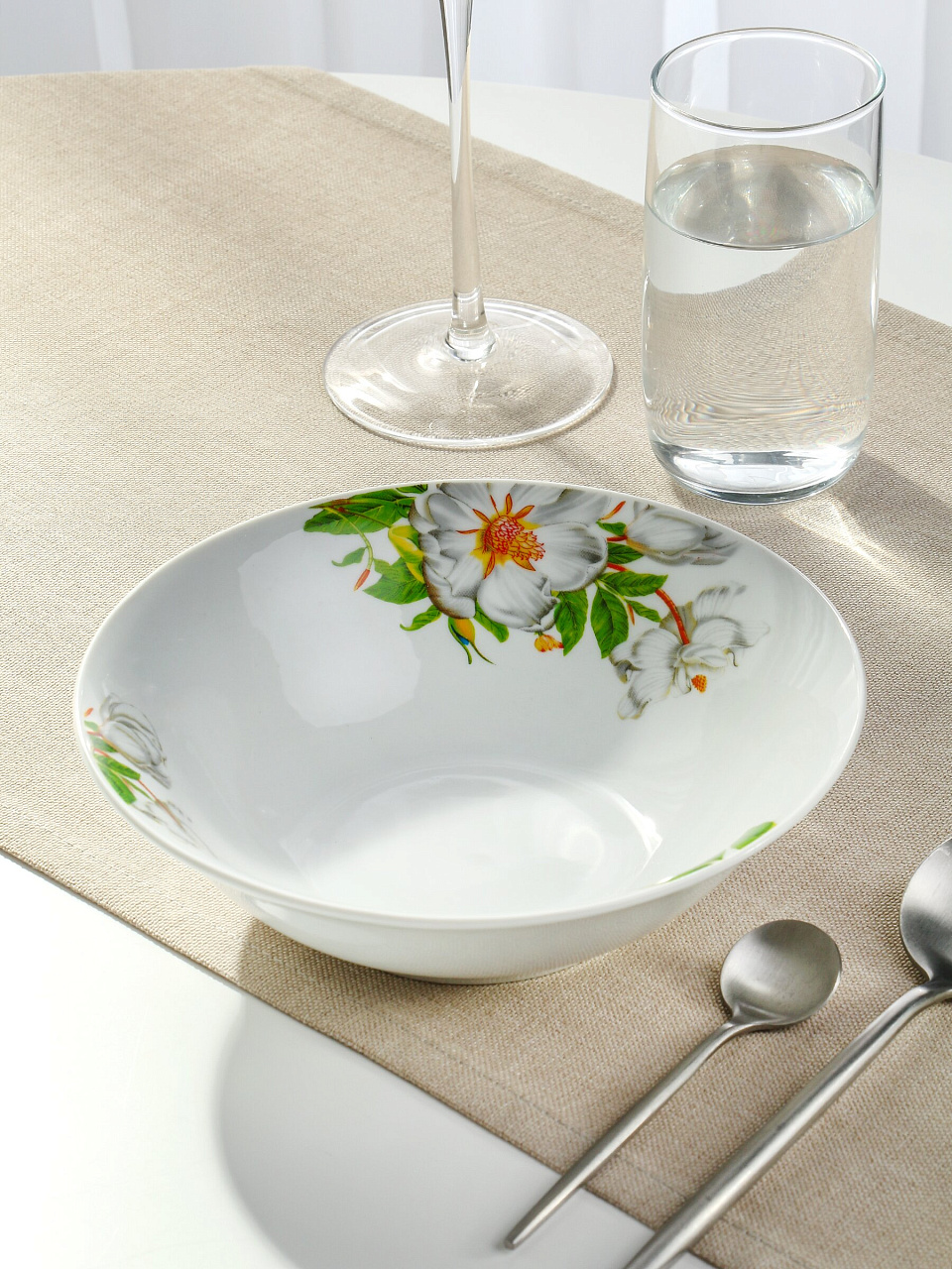 Диаметр — 20 см, высота — 5,5 см, объём — 0,9 л, форма — круглая, цвет — белый с цветочным рисунком.