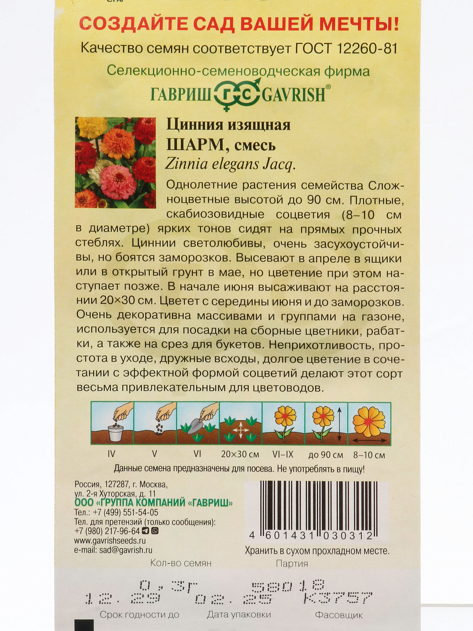 Семена циннии Шарм 0.3 г Гавриш — яркие цветы для сада и дачи: быстрое прорастание, стабильное цветение и простота ухода для новичков и опытных садоводов.