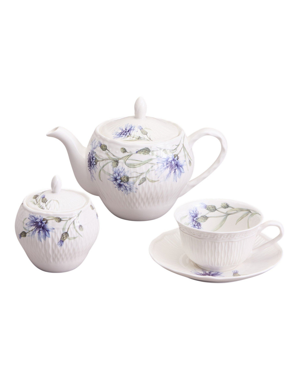 - Эксклюзивный дизайн с цветочным рисунком: каждый предмет сервиза украшен нежными васильками, создавая атмосферу уюта и праздника