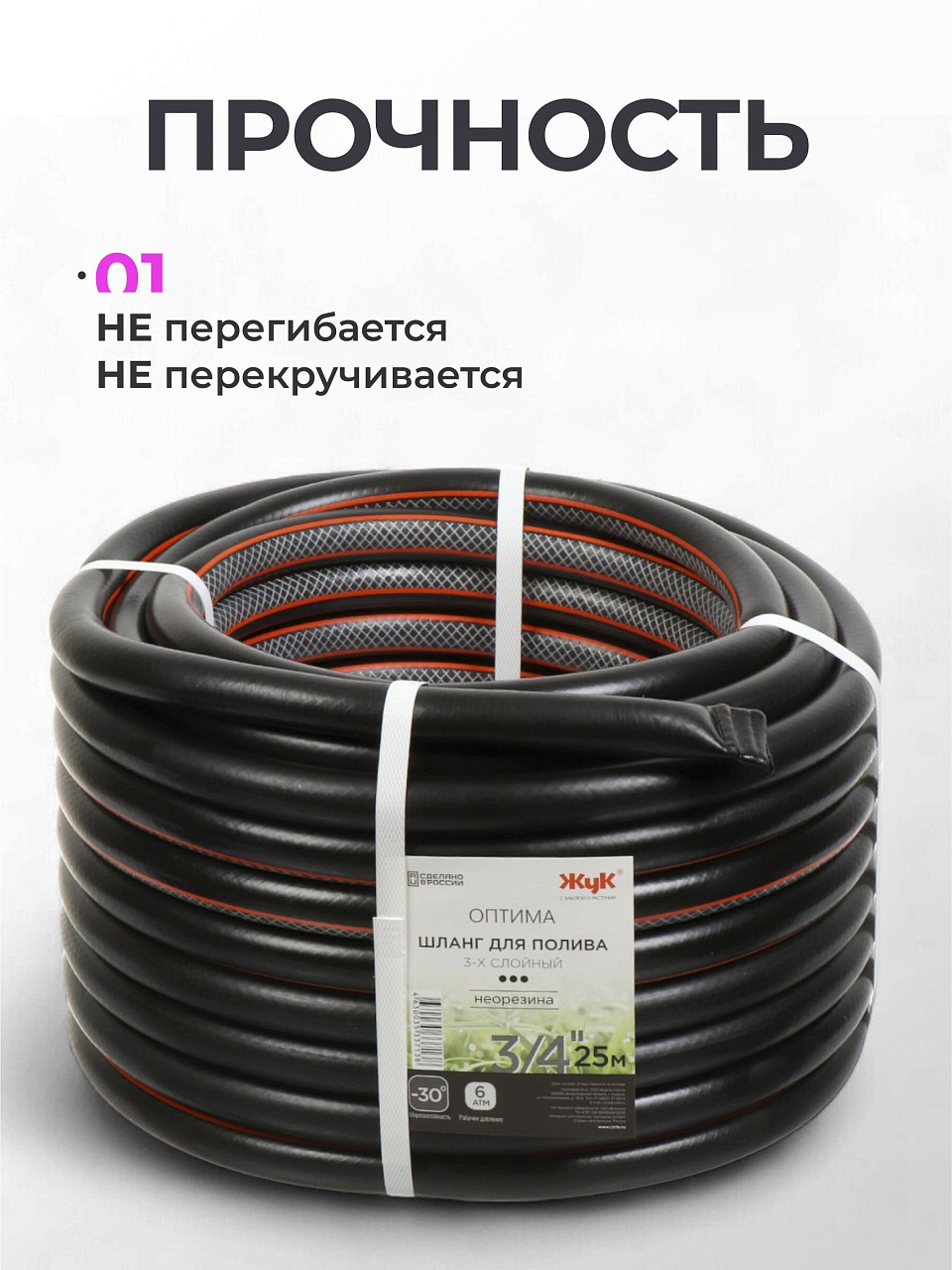 Поливочные шланги Жук серии Оптима выполнены из неорезины (термоэластопласта). Этот материал на ощупь похож на резину, но при этом сохраняет эластичность даже в экстремальный мороз. Неорезина - это полимерный материал объединивший в себе эластичность каучука и прочность ПВХ, при этом лишенный их недостатков: он более легкий, не боится даже экстремального мороза, не деградирует под воздействием солнца или сухого климата.