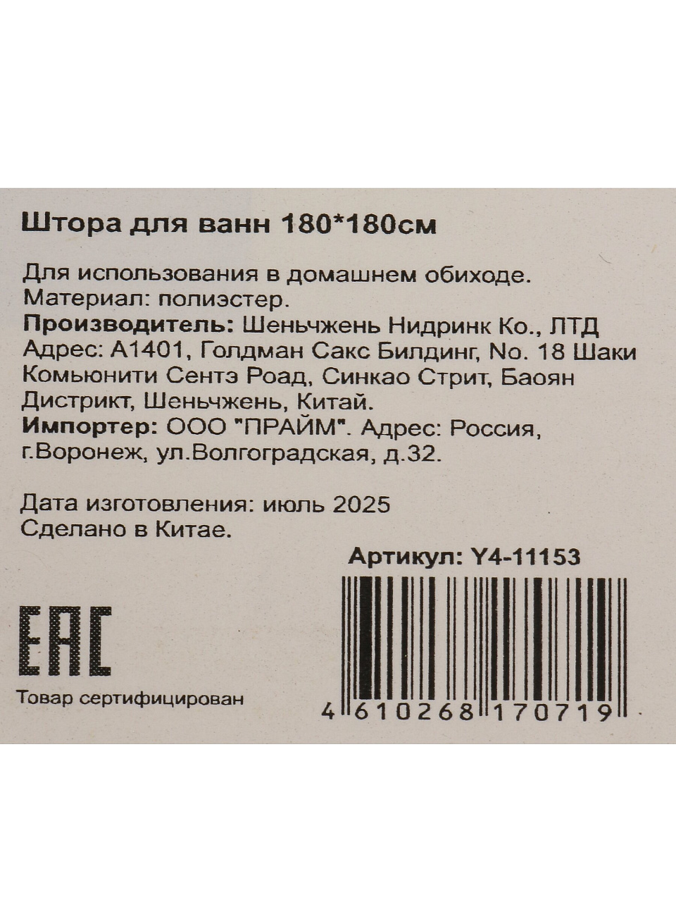 Штора для ванн 180х180 см, ПЭ, Серые полосы, с кольцами, Y4-11153