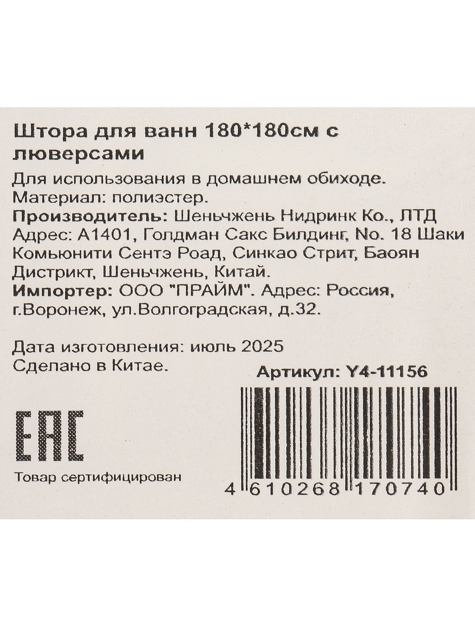 Штора для ванн 180х180 см, ПЭ, Однотонная молочная, с люверсами, Y4-11156