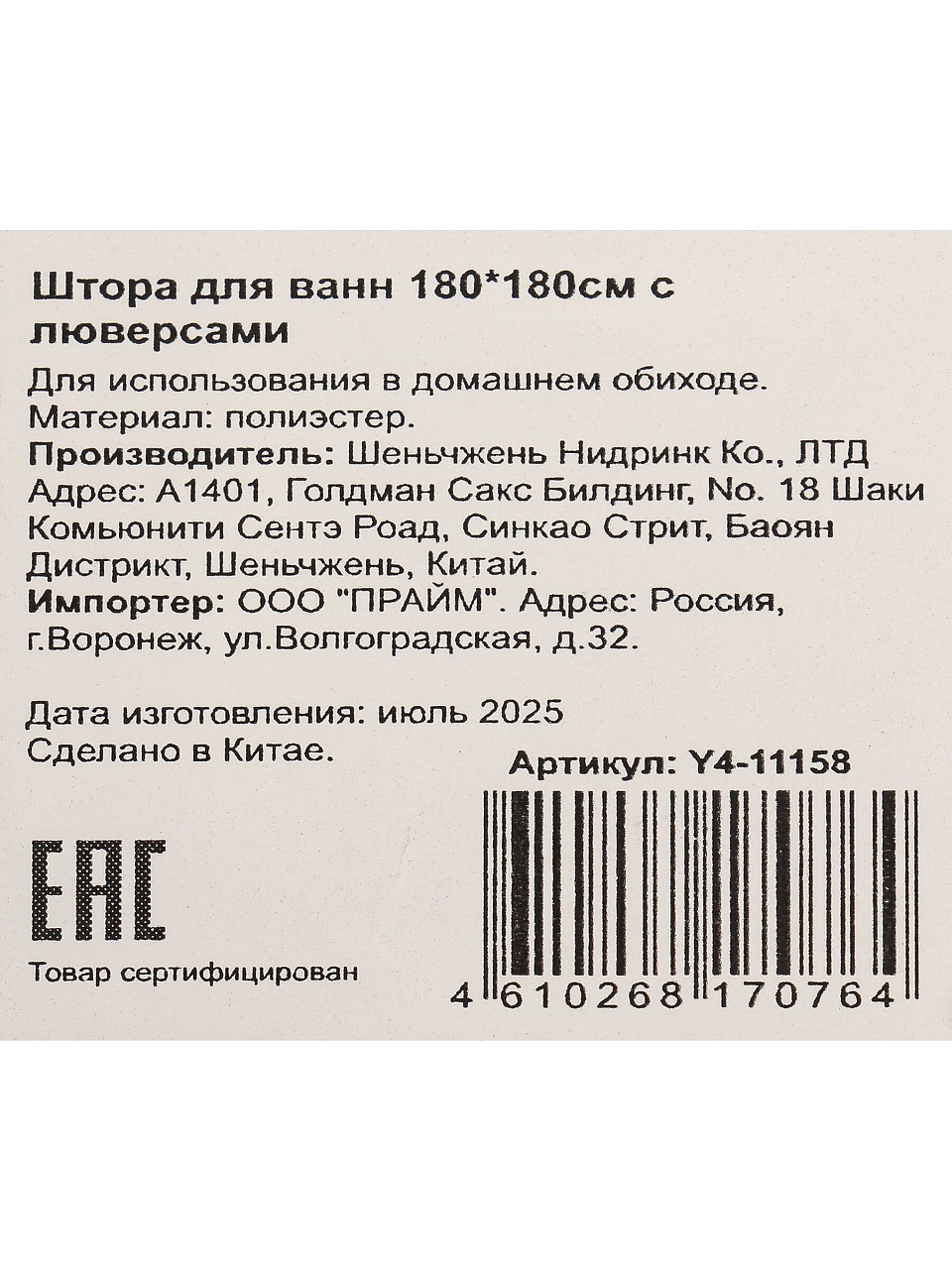 Штора для ванн 180х180 см, ПЭ, Однотонная серая, с люверсами, Y4-11158