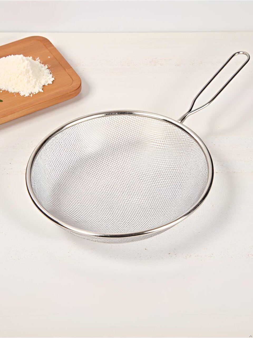 Сито из нержавеющей стали подойдет для просеивания муки, пудры, какао, кофе и других мелких сыпучих продуктов. С помощью большого сита Вы легко украсите сахарной пудрой выпечку, подойдет также для протирки ягоды, промывки фруктов и овощей, профильтруете любую жидкость от мякоти и ненужных остатков. Сито можно использовать для сливания и промывания макарон, риса и других круп.