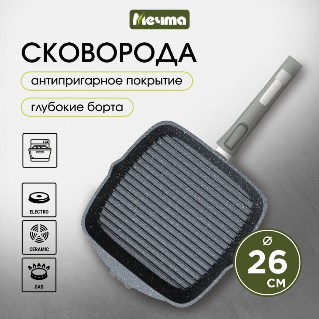 Сковорода-гриль Мечта Гранит Star 26 см — это современное решение для тех, кто ищет, какую сковороду-гриль выбрать для домашнего и дачного использования. Благодаря литому алюминию и рифленому дну блюда получаются с аппетитной корочкой и минимальным количеством масла. Гранитное антипригарное покрытие нового поколения обеспечивает легкую очистку и устойчивость к царапинам, что особенно важно при регулярном использовании.