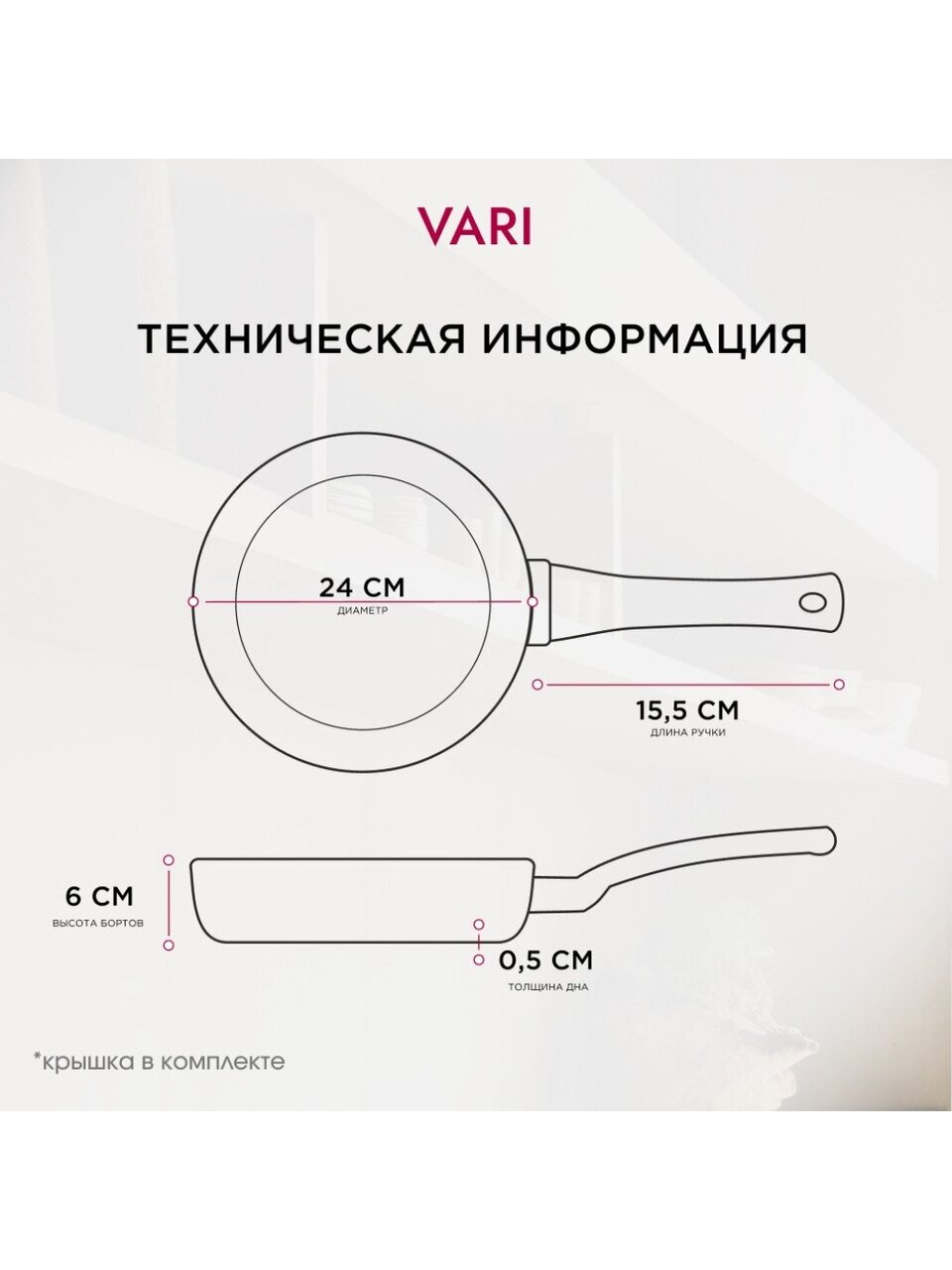 Диаметр сковороды — 24 см, диаметр дна — 18,8 см, высота борта — 60 мм; это позволяет готовить блюда для всей семьи или компании.