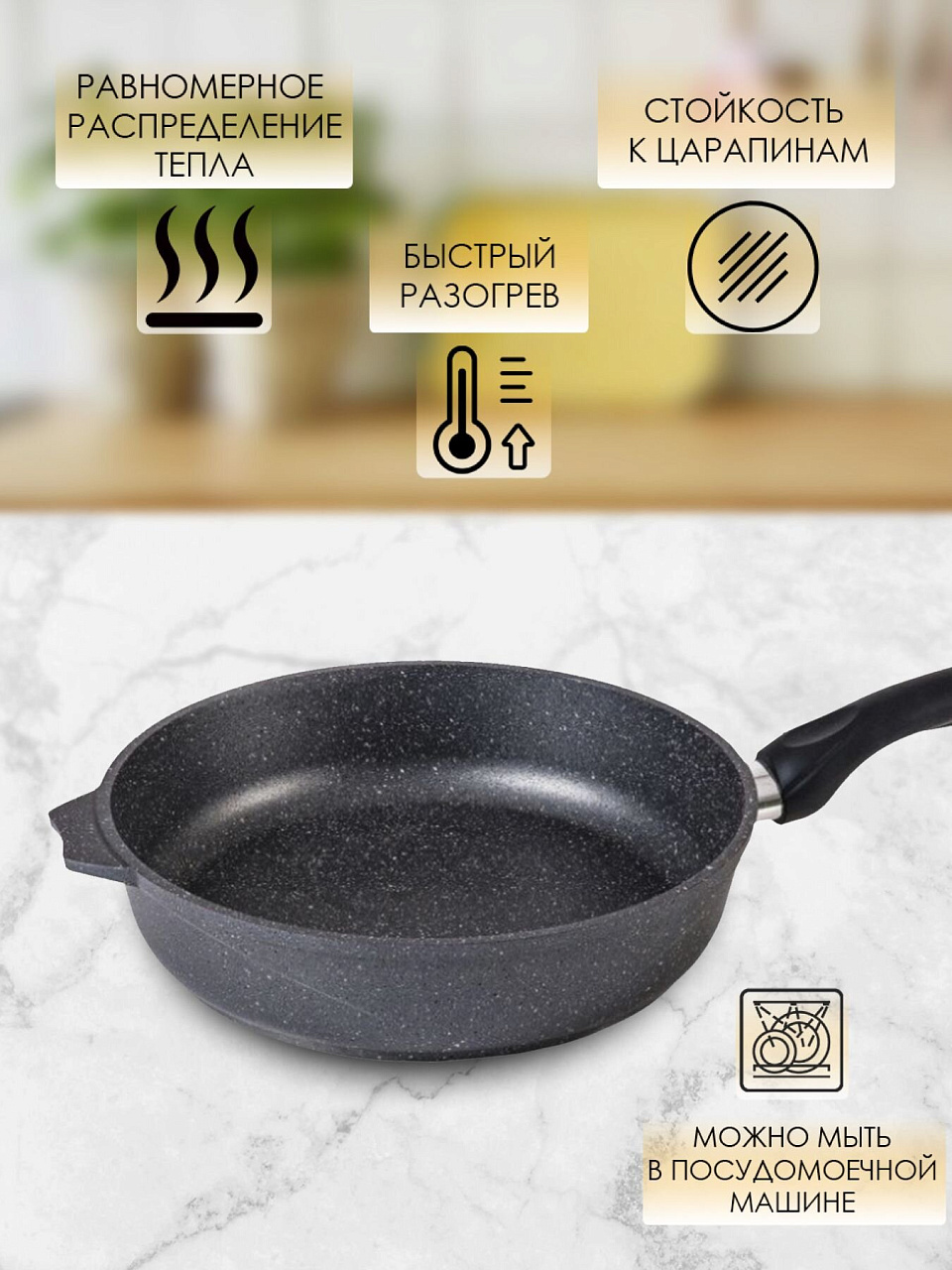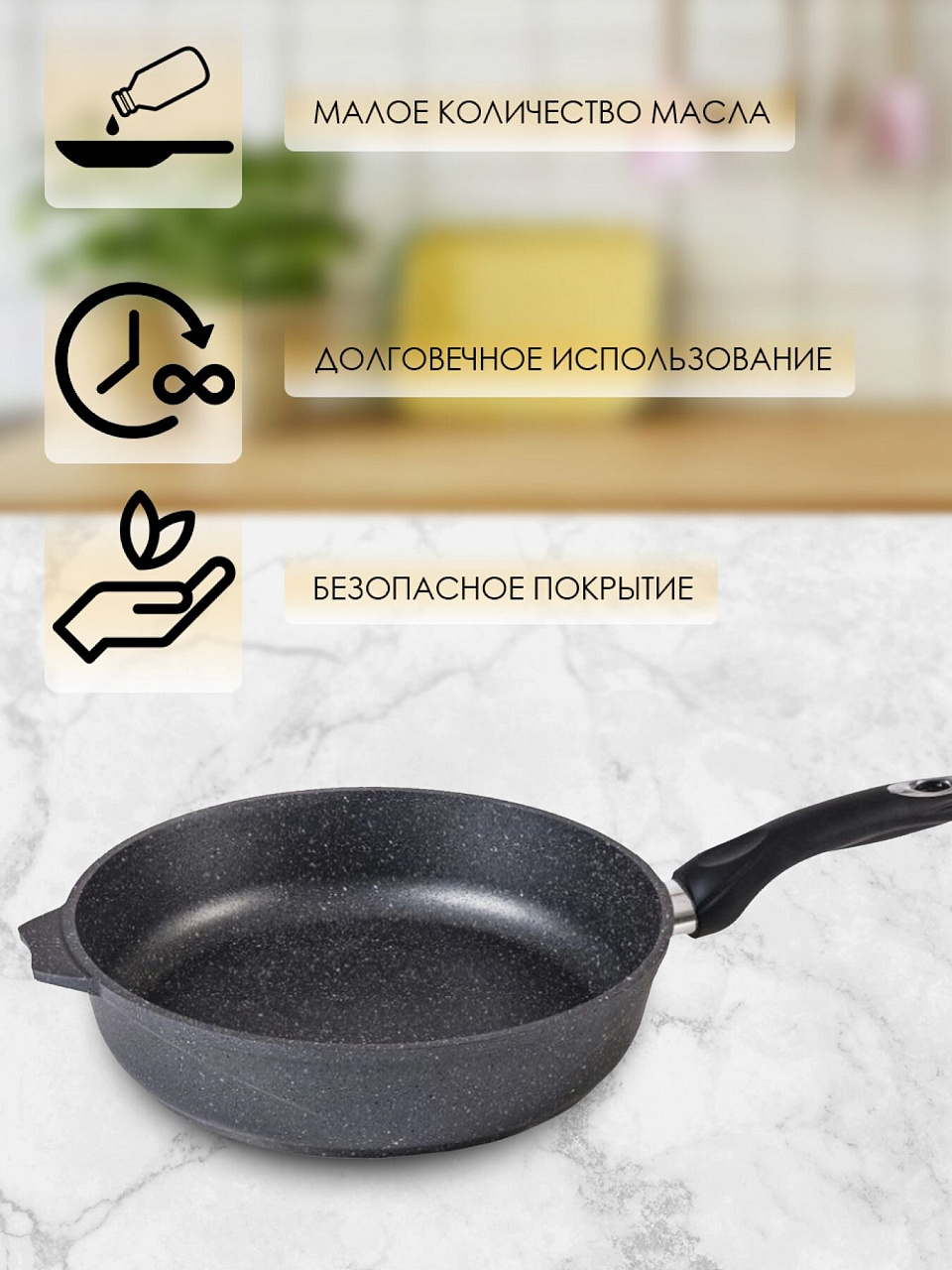 Гранитный слой обеспечивает легкую очистку, позволяет готовить с минимальным количеством масла и предотвращает пригорание — это экономит время и усилия на кухне.