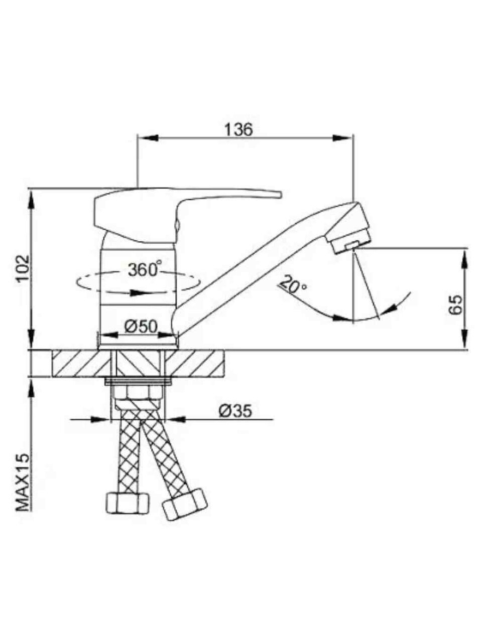 Длина излива — 13,6 см, высота — 6,5 см. Короткий излив и компактная форма делают смеситель идеальным для небольших умывальников и раковин в ограниченном пространстве.