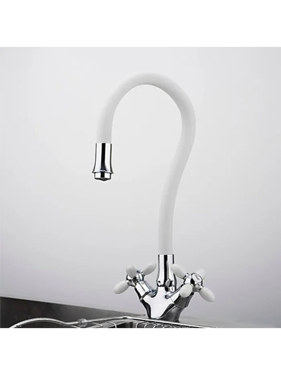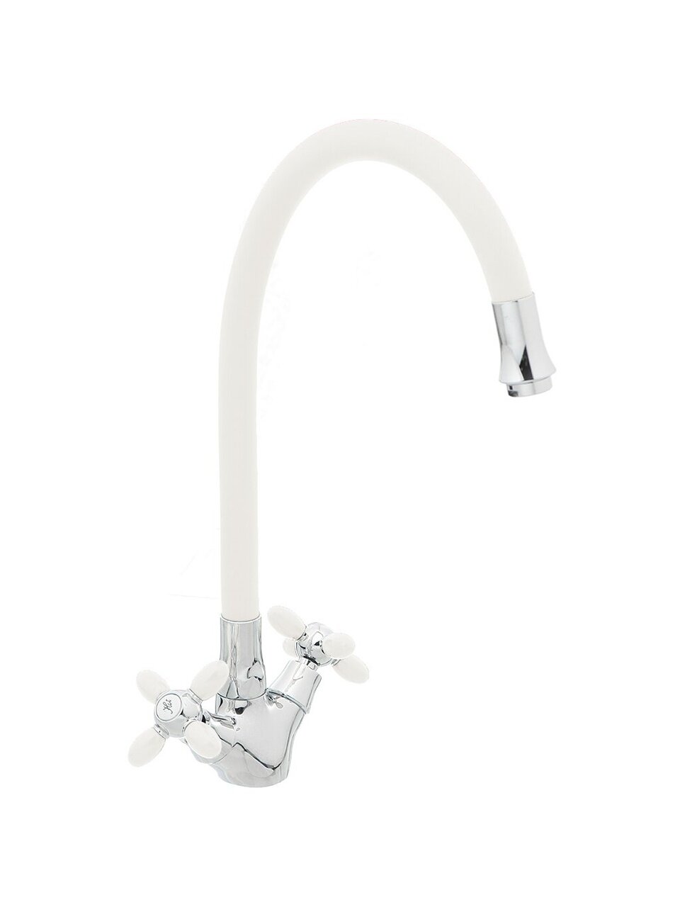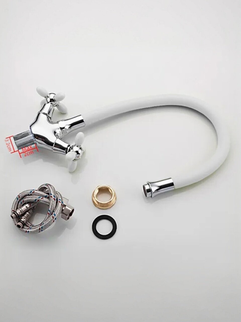 Длина гибкого излива — 49 см, монтаж — горизонтальный, тип управления — двухвентильный, материал корпуса — силумин, цвет — белый, стандарт подводки — 1/2".