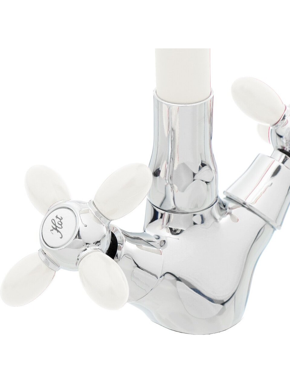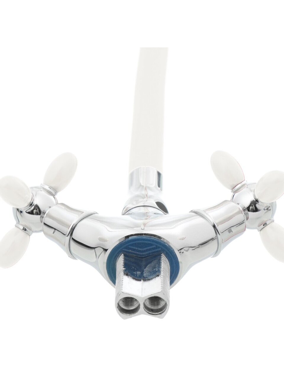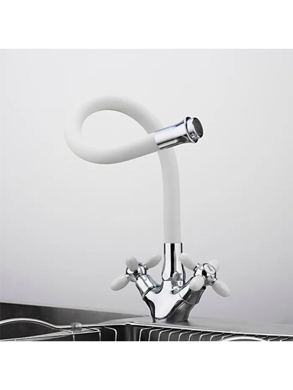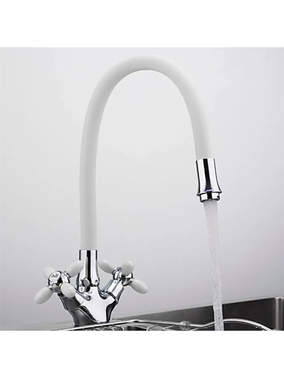 Длина гибкого излива — 49 см, монтаж — горизонтальный, тип управления — двухвентильный, материал корпуса — силумин, цвет — белый, стандарт подводки — 1/2".