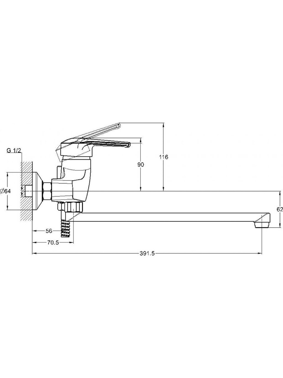 Длина излива — 35 см, монтаж вертикальный, настенный, с межосевым расстоянием 150 мм и двумя отверстиями для крепления.
