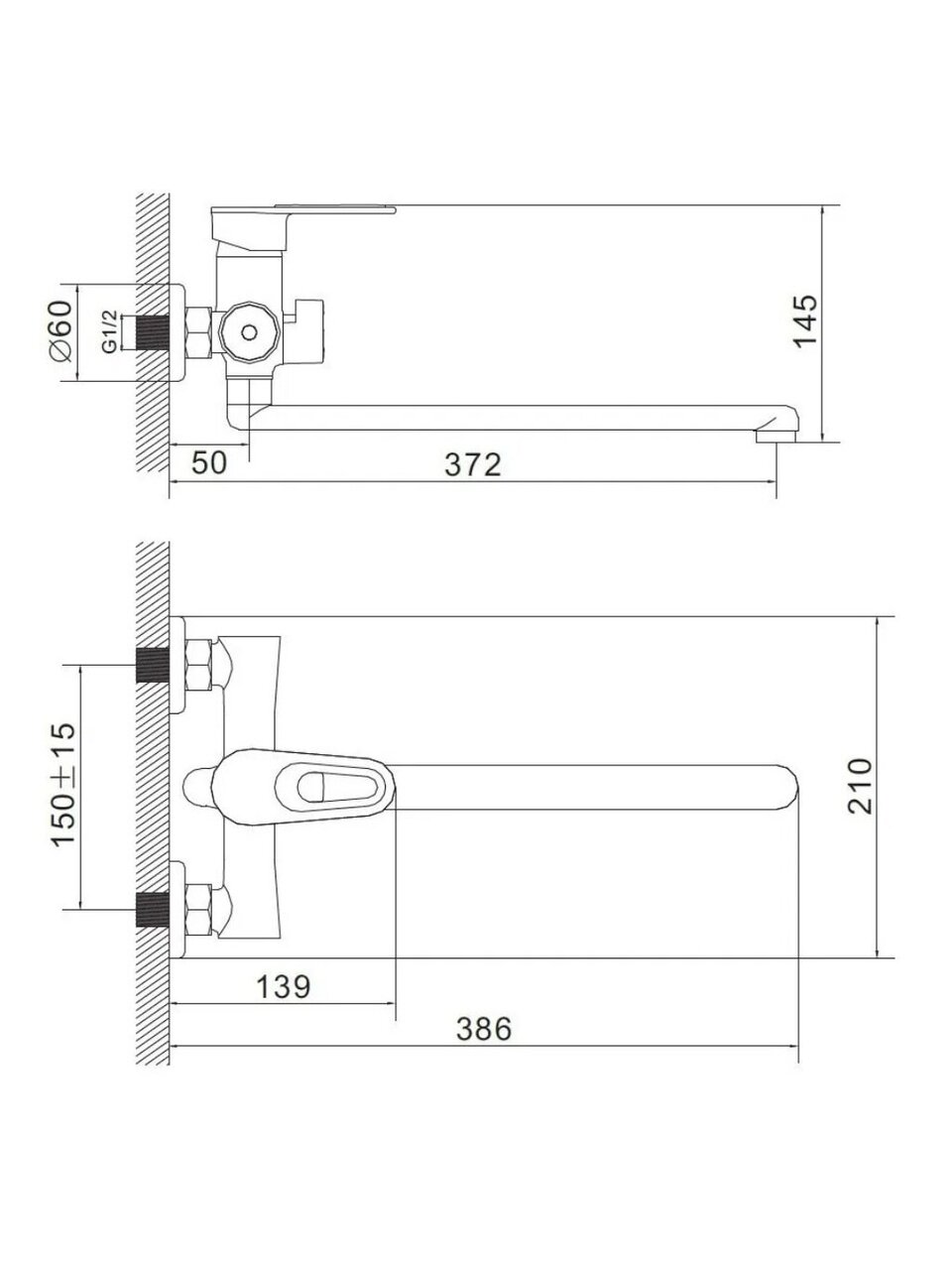 Этот смеситель устанавливается вертикально на стену с помощью двух отверстий и крепится гайкой. Межосевое расстояние — 150 мм.