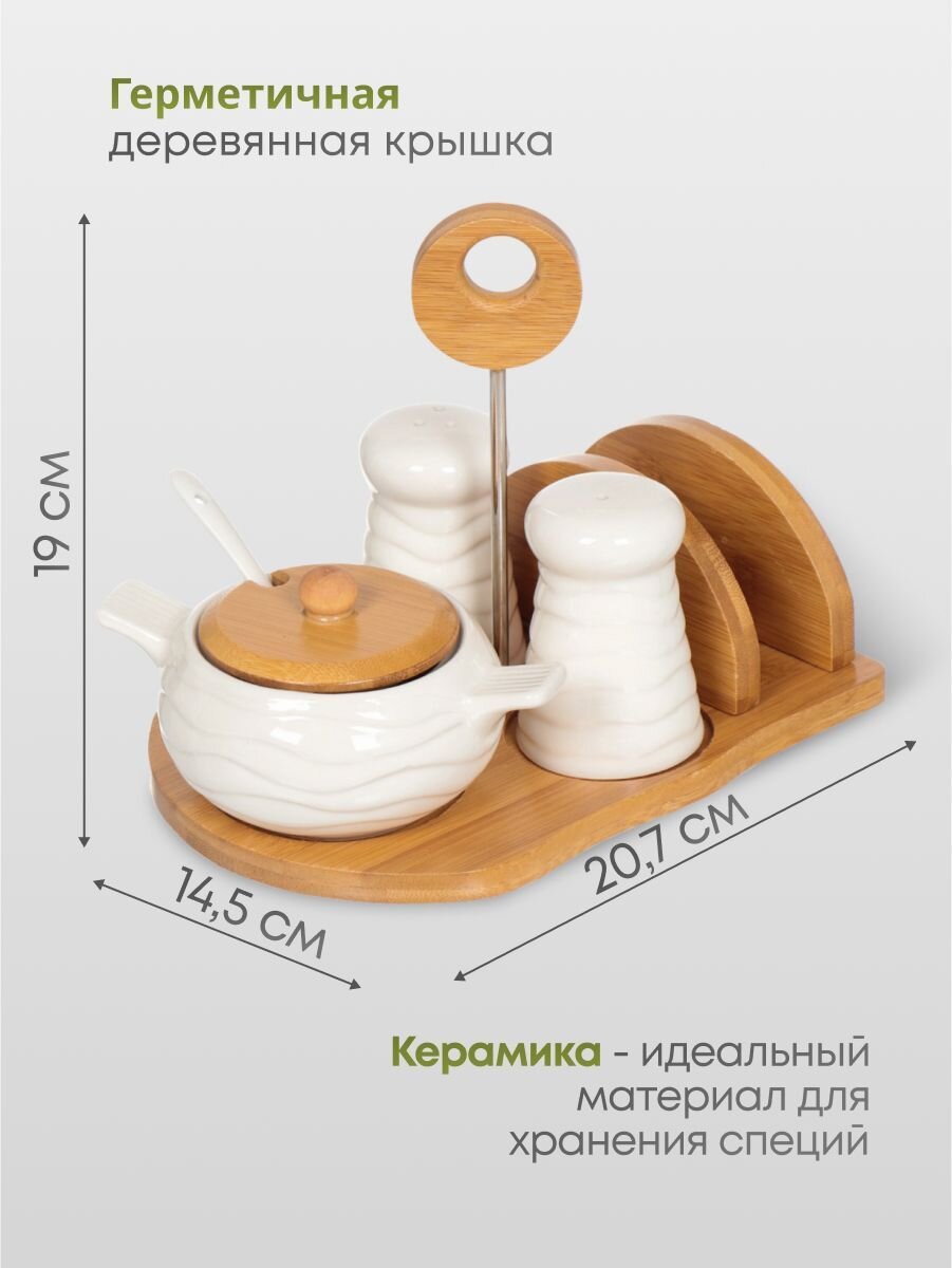 Набор состоит солонки, перечницы, сахарницы с ложкой, салфетницы и подставки. Сахарницу можно использовать как емкость для горчицы или других приправ. Предметы набора изготовлены из белоснежной керамики и имеет элегантный дизайн. Подставка и крышка сахарницы изготовлены из натурального бамбука. Оригинальный дизайн, эстетичность и функциональность набора позволят ему стать достойным дополнением к кухонному инвентарю и оригинальным подарком.
