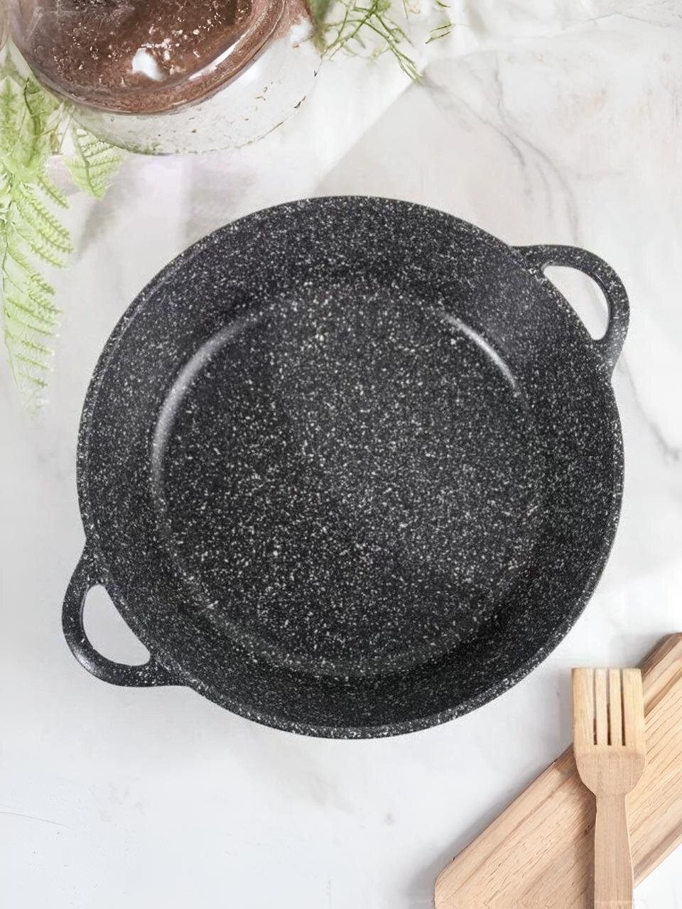 Также в ней можно приготовить плов рагу, жаркое или даже испечь пирог. «Гранит». Коллекция посуды с улучшенным четырёхслойным антипригарным покрытием. Дополнительный слой с мраморным эффектом увеличивает износостойкость и создаёт оригинальный оттенок чёрного мрамора. Литой пищевой алюминий не имеет канцерогенных веществ и посторонних запахов. Толстые стенки и дно обеспечивают равномерное приготовление блюда.