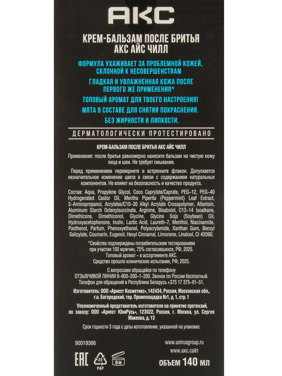 Крем-бальзам после бритья АКС АЙС ЧИЛЛ 140 мл: быстрое снятие раздражения, мгновенное охлаждение и комфорт для чувствительной кожи после каждого бритья.