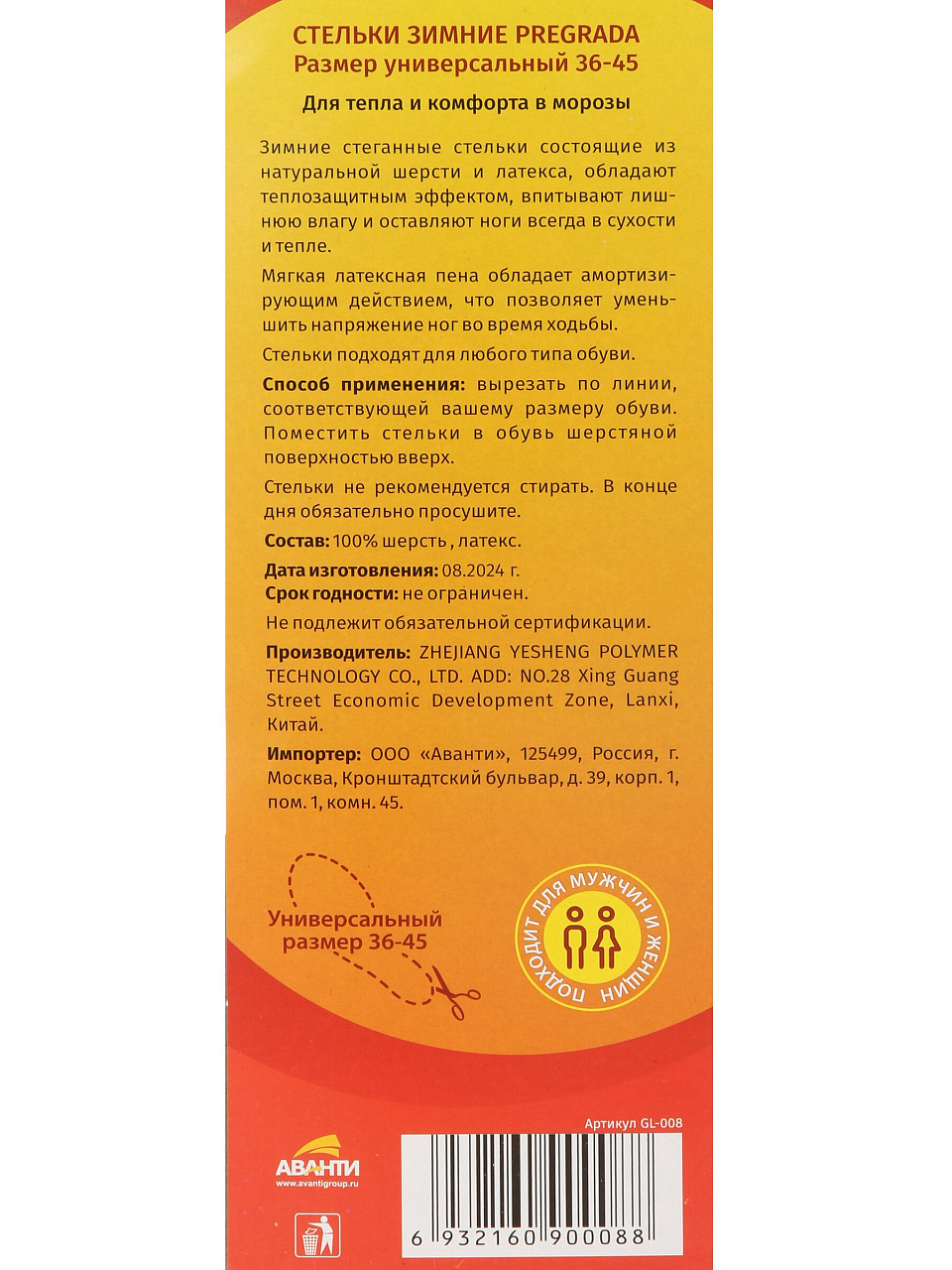 Стельки Pregrada GL-008: сохраняют тепло даже при сильных морозах, 100% шерсть и латекс, универсальный размер 36-46 — комфорт зимой по выгодной цене.