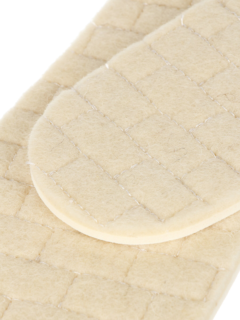 Верхний слой — 100% овечья шерсть, нижний — латекс. Такое сочетание сохраняет тепло, обеспечивает амортизацию и предотвращает скольжение внутри обуви.