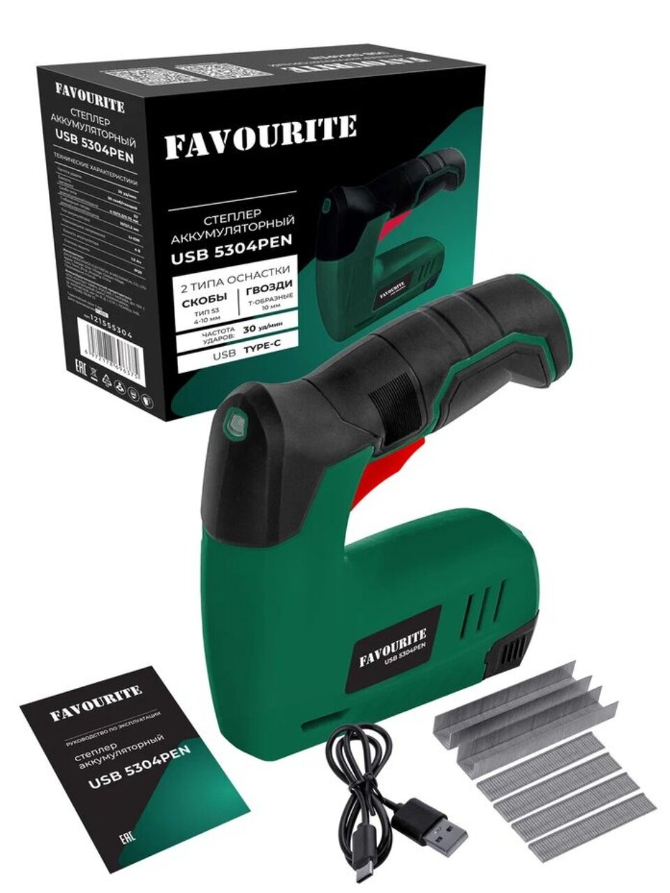 Степлер аккумуляторный Favourite USB 5304PEN: Быстрое и удобное решение для скрепления — до 30 ударов в минуту, универсальные скобы 4-10 мм, зарядка от USB.