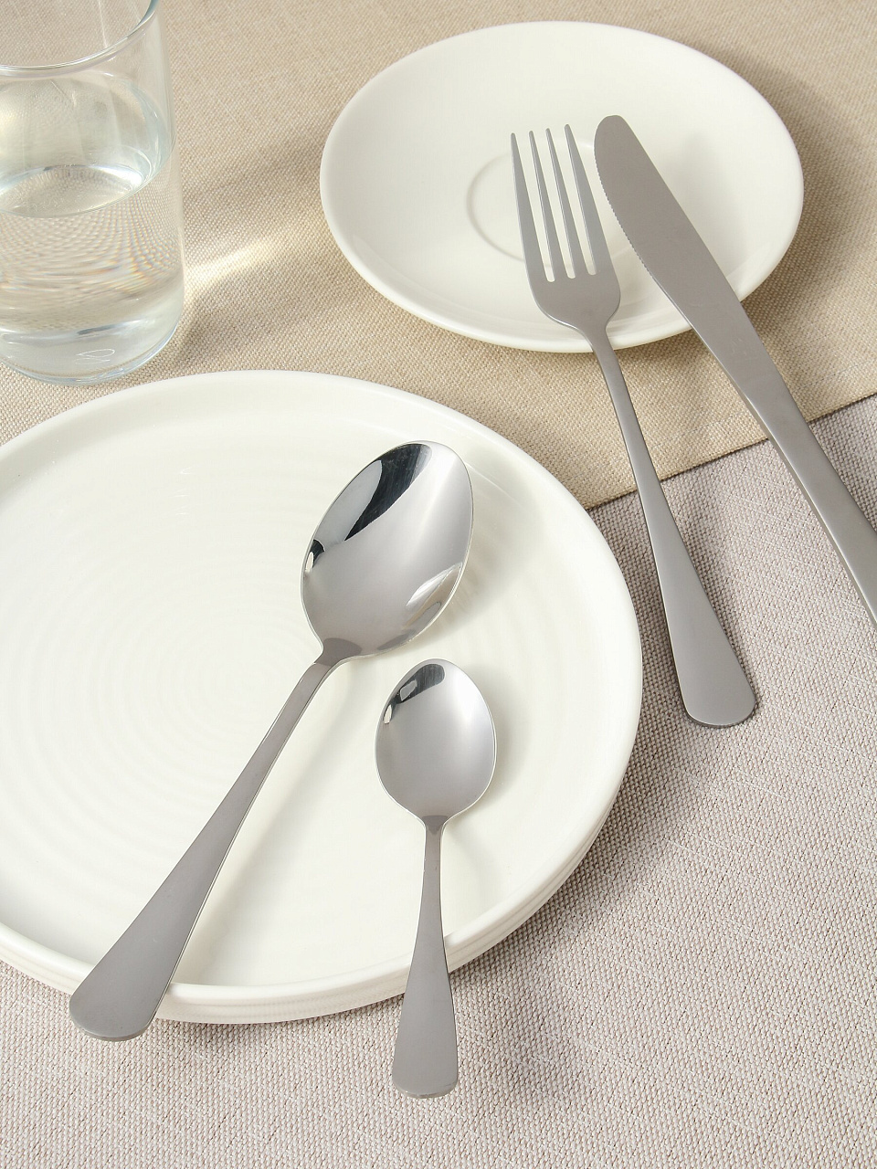 В наборе 24 столовых прибора: ложки, вилки, ножи и чайные ложки — по 6 штук каждого вида. Материал — нержавеющая сталь без покрытия, ручки металлические, цвет серебристый.