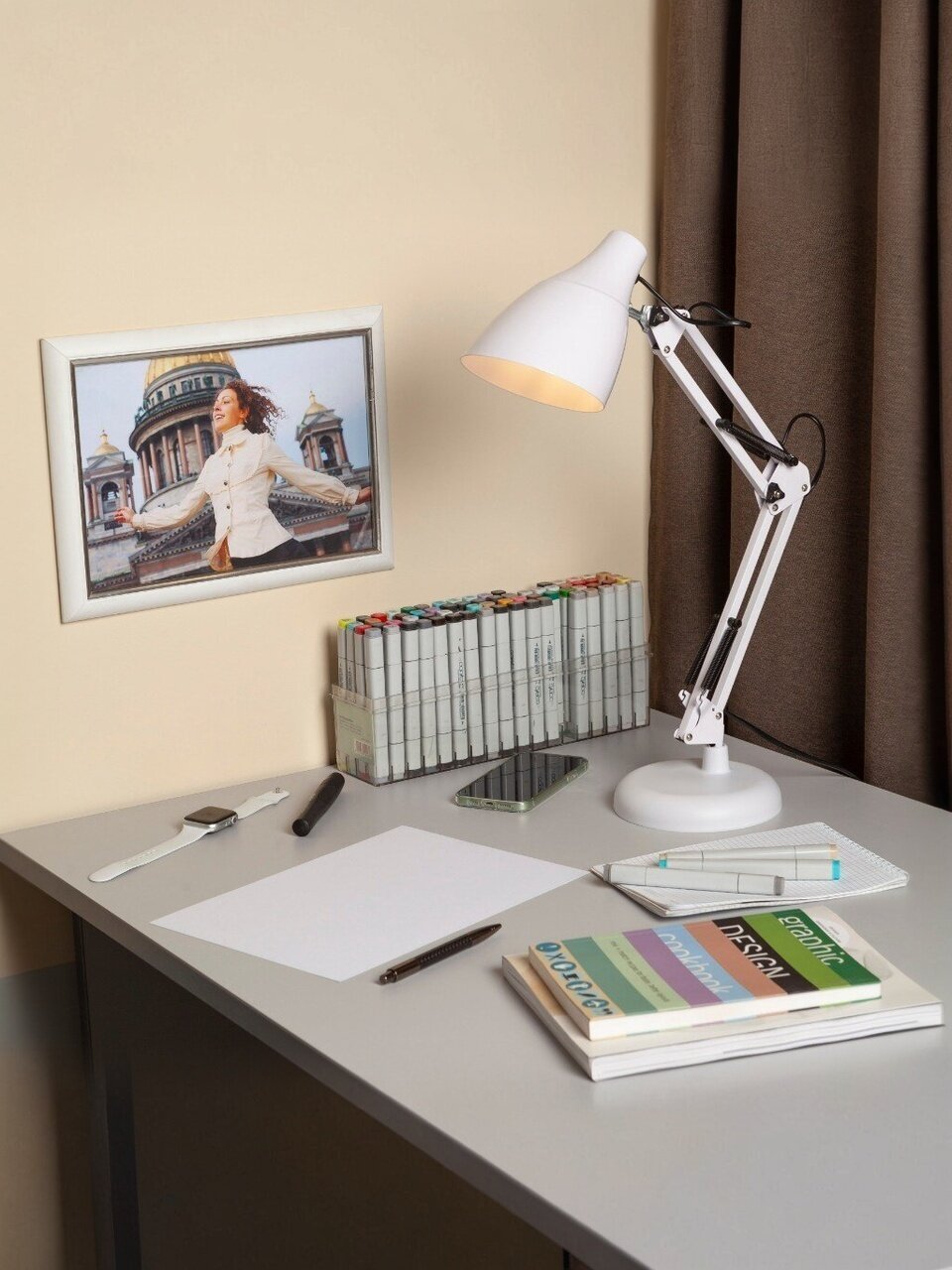 Настольный светильник ЭРА N-123-Е27-40W-W трендового дизайна с классической конструкцией может использоваться с разными источниками света - лампой накаливания, компактной люминесцентной лампой (КЛЛ) или светодиодной (LED) лампой. Выключатель на проводе. Устойчивое основание. Высота плафона регулируется двухсекционной сгибающейся стойкой, направление света - поворотом и наклоном плафона в любом направлении. Лампа в комплект не входит.