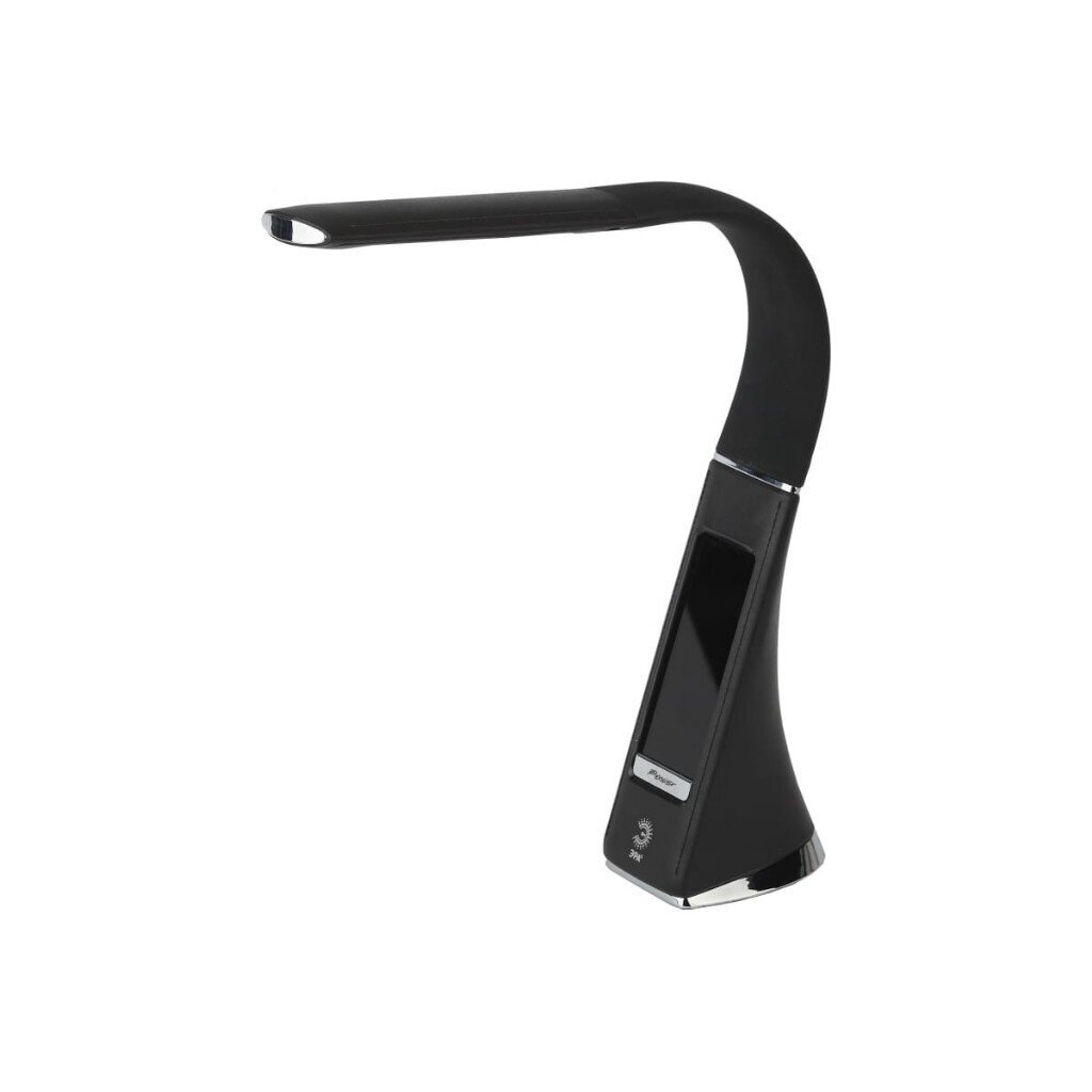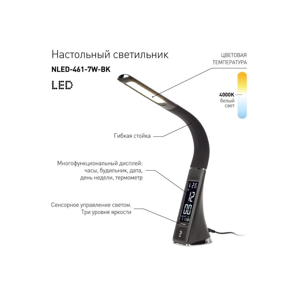 Настольный светильник ЭРА NLED-461-7W-BK со светодиодами (LED) в качестве источников света в дизайне "под кожу". Оснащен сенсорным управлением, есть регулировки яркости освещения - 3 уровня. Главное преимущество светильника - ЖК дисплей с функциями часов, будильника, календаря и термометра. Сенсорная кнопка с обратной стороны стойки обеспечивает опцию выбора яркости дисплея с возможностью его выключения. Высота плафона регулируется гибкой стойкой, направление света регулируется поворотом плафона в любом направлении.