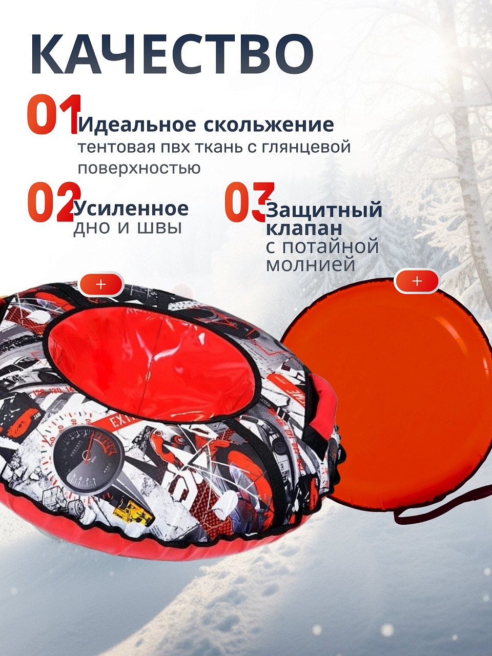 Красочный тюбинг из принтованной ткани подарит незабываемые впечатления от зимней прогулки. Водонепроницаемая ткань, из которой изготовлена верхняя часть изделия, создаст дополнительное сопротивление и не позволит выскользнуть из тюбинга. А благодаря высококачественной тентовой ПВХ ткани с глянцевой поверхностью, из которой исполнено дно этой модели, достигается идеальное скольжение.