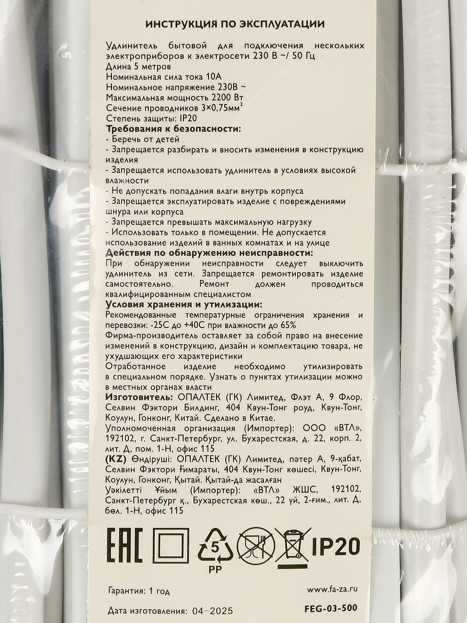Удлинитель бытовой 3 гнезда, 5 м, ПВС, 3х0.75 мм², с заземлением, 10 А, белый, ФАZА, FEG-03-500, 5052871 - фото 1 от пользователя