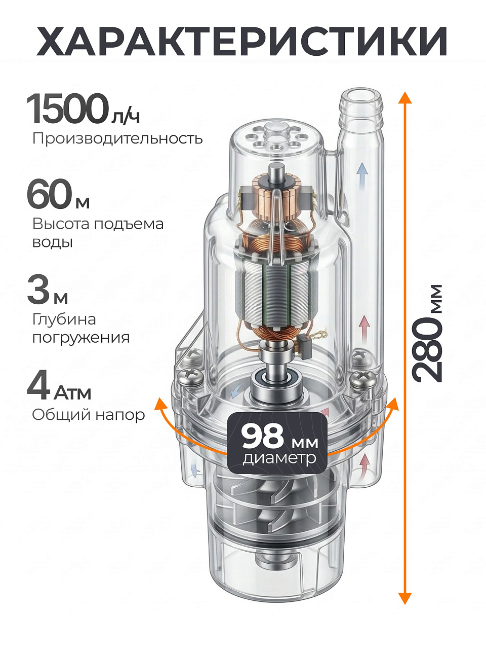 - Диаметр насоса: 98 мм.