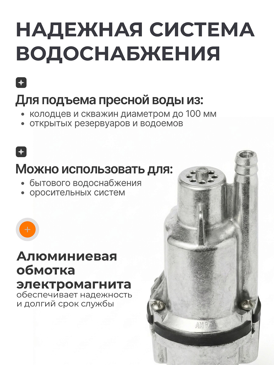 - Предназначен для подачи воды из шахтных колодцев и скважин с внутренним диаметром не менее 100 мм.