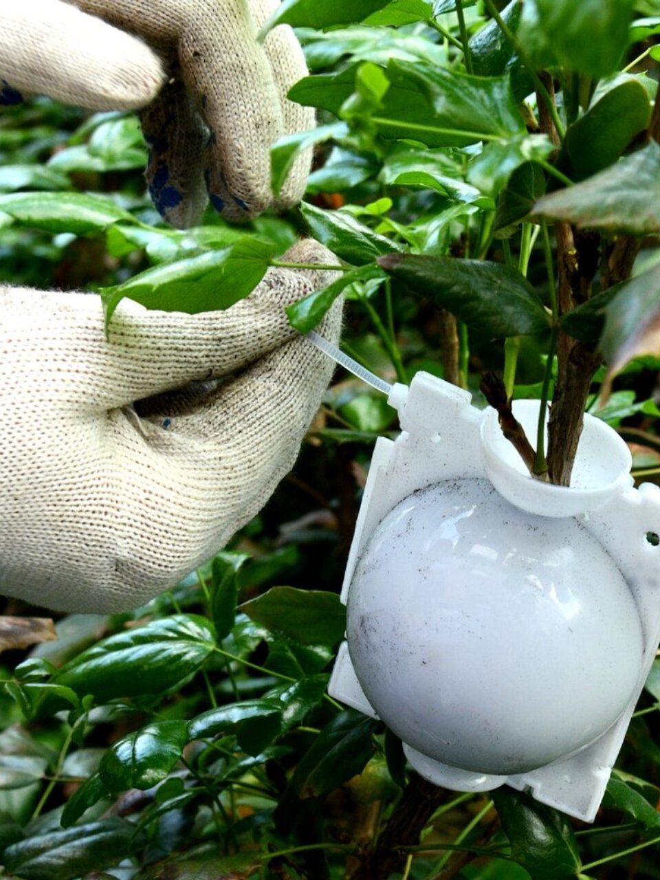 Откройте шар, поместите внутрь влажный субстрат, зафиксируйте его на выбранном побеге и защёлкните. Оставьте до появления корней, затем отделите новое растение.