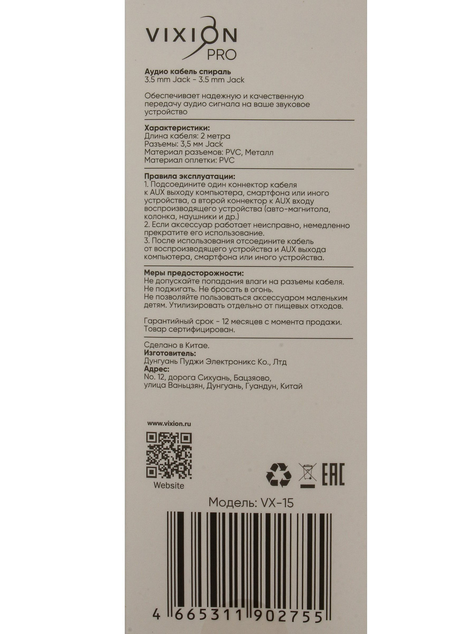 Модель: VX-15, длина — 2 м, разъёмы Jack-Jack 3.5 мм, цвет — чёрный, гарантия — 12 месяцев, артикул производителя: GS-00028892.